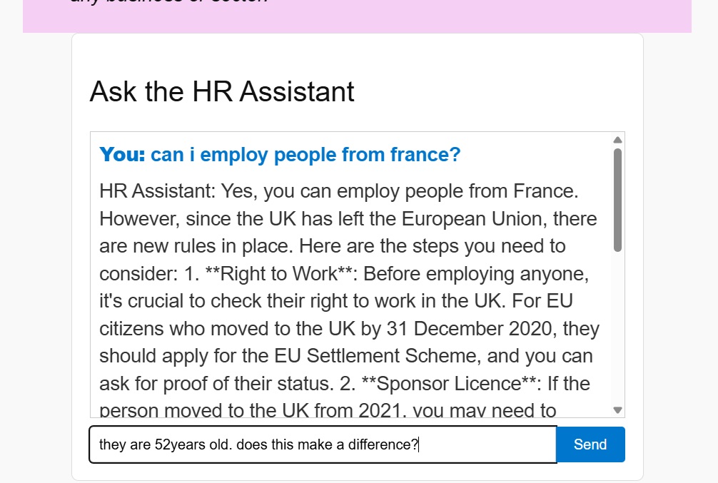 In the demo I’ve built, it’s focused on helping small hospitality businesses in the UK answer HR-related questions. It explains things in plain English, follows UK employment law, and politely shuts down anything that’s off-topic.